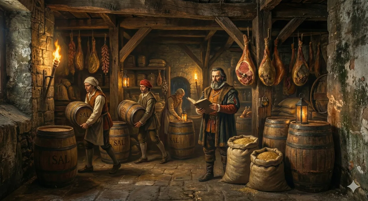 Ve sklepeních se muselo hospodařit s vodou, obilím a nasoleným masem. Zde se přirozeně vyvinula metoda FIFO (First In, First Out). Pokud byste snědli čerstvé zásoby a nechali ty staré ležet, v době krize byste našli jen zkažené jídlo a hrad by padl. Logistika zde byla doslova otázkou života a smrti. Sůl, jakožto hlavní konzervant, měla cenu zlata a její doprava a skladování byly strategickou prioritou.